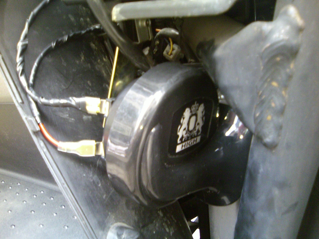 また、一般的なオートバイと比べると、バッテリーの容量が大きめだった事を考えて、試しに仮配線で分岐して、ホーンをつないでみる事に・・・すると