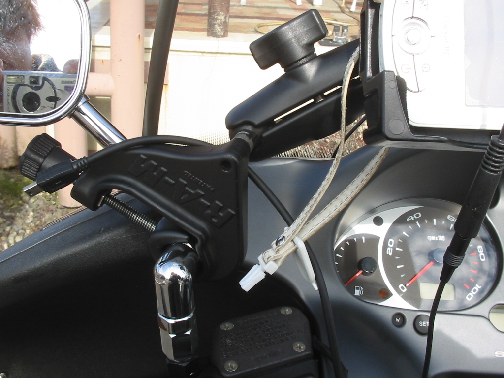ミラーステーのくの字型の部分に、丁度マウントを挟み込めます。